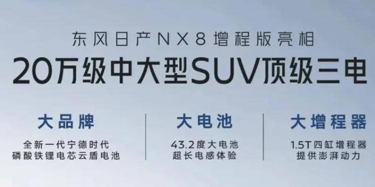 日产NX8增程版的官图在2月7日被负责发布了。动作东风日产打造的全新中大型SUV,NX8基于天演架构打造而来,提供纯电版及增程版以供破钞者聘用,其中NX8增程版搭载1.5T四缸增程器,配备43.2度宁德时期磷酸铁锂电板,瞻望新车将于本年二季度上市销售。外形上,新车不时了家眷最新的遐想言语,阻滞式的前脸也很好地展示了其新能源车的身份。